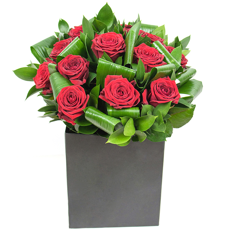 Experience the timeless beauty of our stunning red rose bouquet, thoughtfully combined with lush aspidistra leaves and verdant ruscus. This unique arrangement adds style and sophistication to any space.