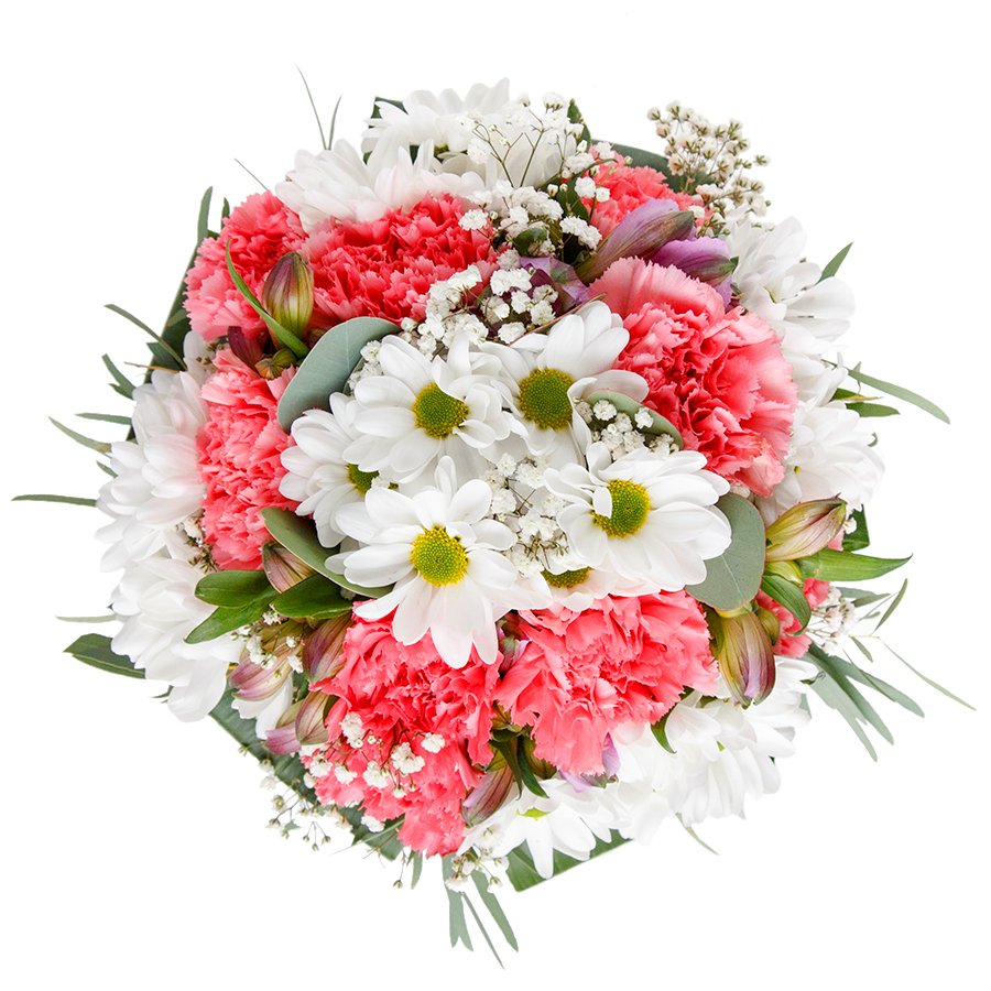 Celebrate beauty and uniqueness with our timeless flower arrangement. This exquisite bouquet combines snow-white chrysanthemums, delicate gypsophila, and soft pink carnations, all gracefully arranged with vibrant aspidistra leaves for an elegant touch.